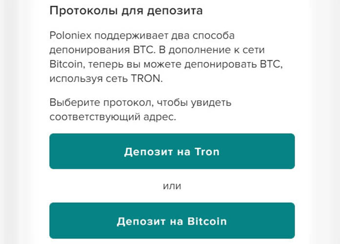 Для пополнения баланса монетами необходимо выбрать в главном меню «Кошелек» и перейти во вкладку «Депозиты». Слева откроется длинный список поддерживаемых криптовалют. В нем можно выбрать нужную и нажать на кнопку пополнения счета. Справа появится информация для транзакции — QR-код и адрес кошелька. По ним нужно сделать перевод на определенную сумму. Для некоторых криптовалют предусмотрен выбор протокола. Например, в BTC платеж можно провести через сеть Bitcoin или TRON.