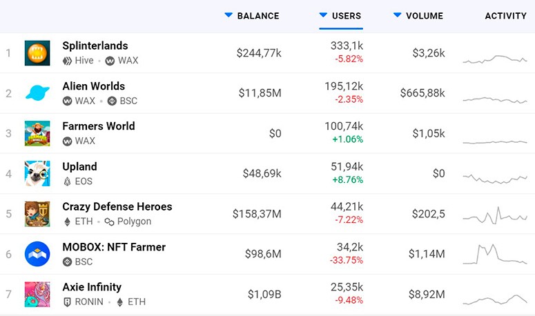 В феврале 2022 года это крупнейший проект из сектора GameFi. Axie Infinity работает на алгоритме Play-to-Earn. Его капитализация составляет $11,56 млрд. Задача игрока — выращивать, размножать, улучшать монстров и участвовать в борьбе с другими существами в режимах PVE (против мобов) и PVP (сражения с пользователями). В процессе он получает награды в виде токенов AXS и SLP. Разработчики Axie Infinity также создали торговую платформу, на которой игроки продают и покупают предметы, монстров и различные артефакты.