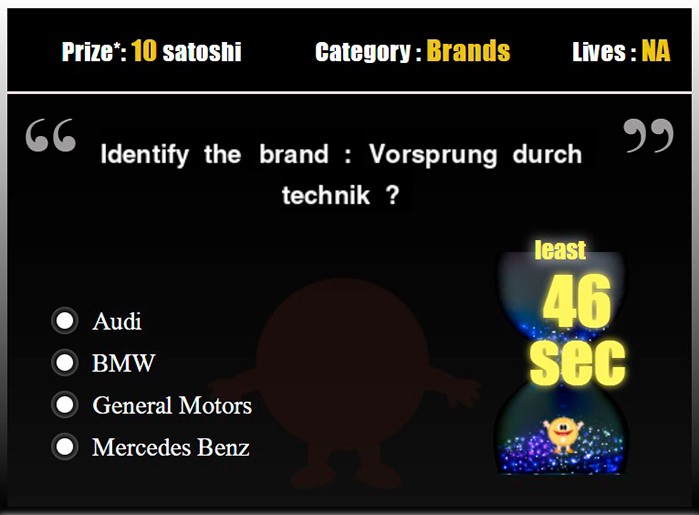 Игра, в которой можно заработать Bitcoin без вложений, предлагает участвовать в викторине и отвечать на вопросы. В Satochi Quiz не получится применять поисковые системы для быстрого нахождения ответов. Пользователи могут рассчитывать только на знания. За каждый правильный ответ система платит 10 сатоши. Вывод средств возможен от 0,00011 BTC. Приложение доступно в браузере и адаптировано для пользователей мобильных устройств.
