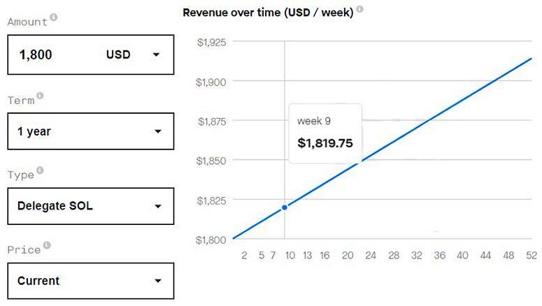 Предположим, пользователь участвует в стейкинге криптовалюты Solana. По данным сайта StakingRewards, валидаторы зарабатывают 6,37%. Если пользователь отправил в стейкинг 100 монет, за 1 год он получит 6,37 SOL. Однако заработок уменьшится при падении стоимости криптовалюты. Если цена монеты сильно снизится, будет неважно, насколько большие проценты предлагают разработчики.