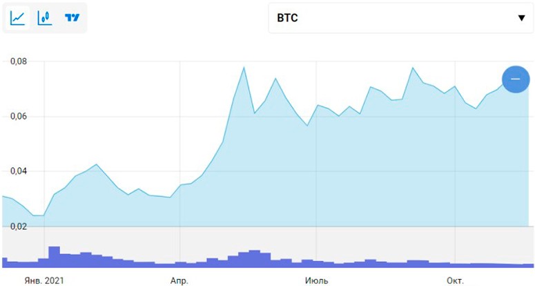 Достаточно посмотреть на популярные криптовалюты по размеру капитализации. Binance Coin, Solana, Cardano, Polkadot и Terra работают на PoS. Совсем скоро к ним добавят Ethereum, поэтому альтернативный алгоритм добычи монет будет доминировать на рынке. У пользователей положительные ожидания касательно перехода на Ethereum 2.0. Об этом говорит курс монеты, который за последний год вырос относительно биткоина c 0,03 до 0,073 BTC.