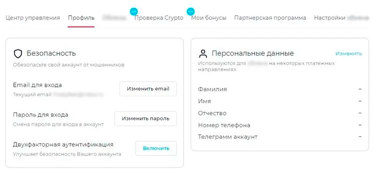 - «Профиль». Это основной раздел личного кабинета. В нем работают с персональной информацией и настраивают безопасность аккаунта. Например, клиенты могут устанавливать двухфакторную аутентификацию.