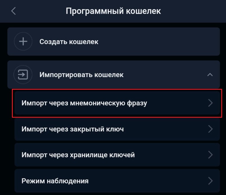 - Выбрать пункт «Импорт через мнемоническую фразу».