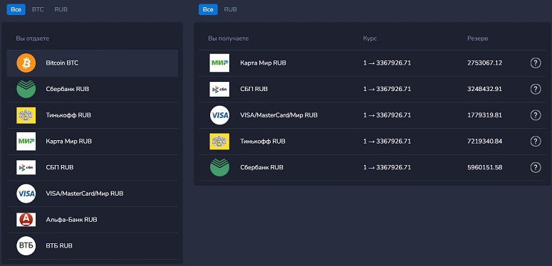 | Рублевые карты Сбербанк, ВТБ, Альфа-Банк, Тинькофф, система быстрых платежей | BTC |