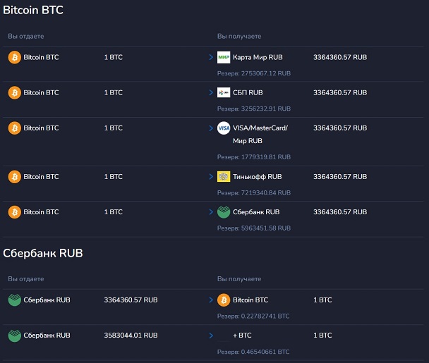 - «Тарифы». На странице собраны текущие курсы и резервы по всем направлениям обмена.