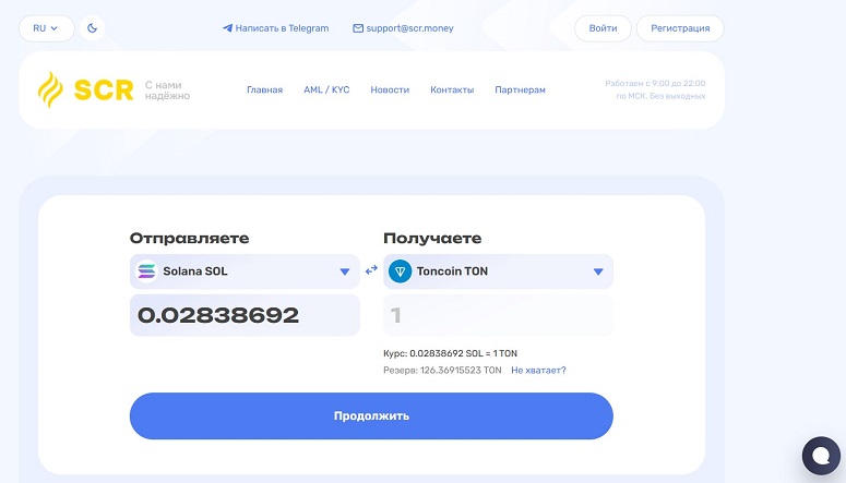 Официальный сайт SCR Money оформлен в минималистичном дизайне. Интерфейс не перегружен, содержит только необходимые для работы функции. Поэтому совершить обмен удастся даже новичку с базовым пониманием криптовалют. Если потребуется помощь, можно кликнуть по иконке онлайн-чата и обратиться к оператору.