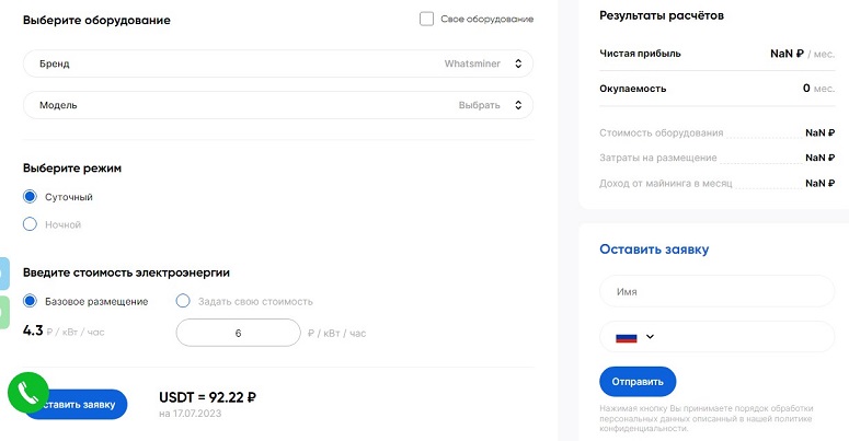 ASIC-майнер можно выбрать из каталога на сайте. Для оформления заказа надо заполнить форму — указать модель, количество устройств и контактные данные. Также можно заключить договор лизинга и рассчитать потенциальную прибыль с помощью калькулятора.