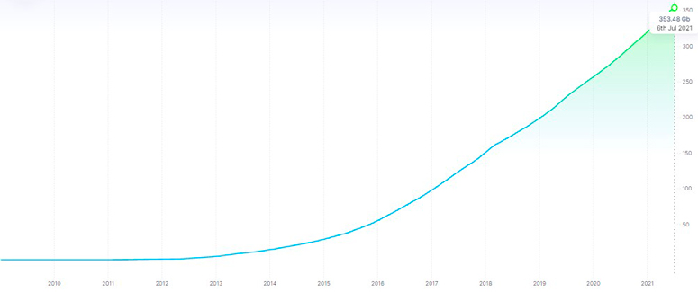 При разработке криптовалют используются разные технологии и алгоритмы консенсуса. Одним из показателей, характеризующим распределенную цепочку блоков, выступает ее размер. Значение этого параметра растет по экспоненциальной зависимости. Например, в сентябре 2020 объем распределенной цепочки блоков криптовалюты №1 впервые превысил 300 гигабайт, а в середине 2021 года блокчейн биткоина весит уже 352 Гб.