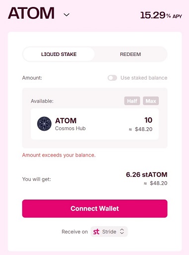 Ликвидный стейкинг Cosmos доступен на Stride, pSTAKE Finance, Quicksilver Protocol и других популярных платформах. Обмен не обязательно производится в соотношении 1 к 1, но в долларовом эквиваленте стоимость производных токенов соответствует цене базового актива.