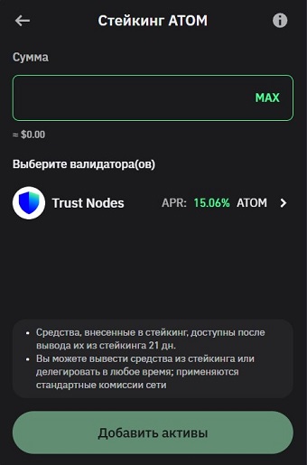Ниже размещена инструкция по блокировке Cosmos в кошельке Trust Wallet. Пользователи могут разместить любое количество монет. Доходность зависит от выбранного валидатора.