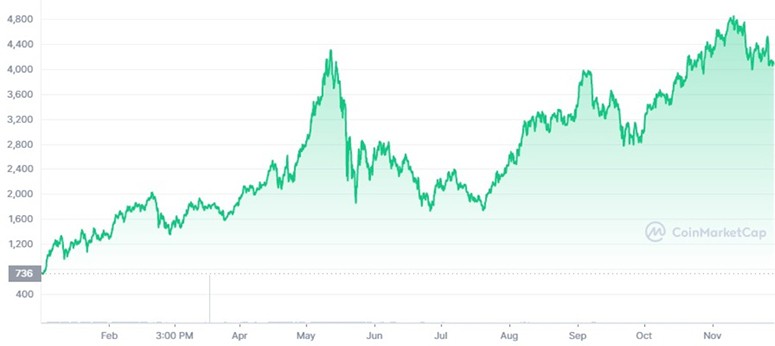 В таблице отражены все ценовые рекорды ETH в 2021 году.