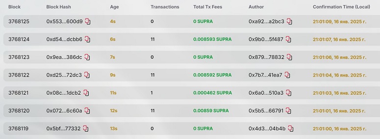 Скорость проверки транзакций и формирования блоков можно посмотреть в сетевом обозревателе SupraScan. Информация отображается в реальном времени.
