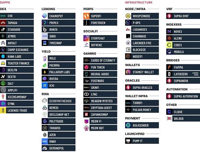 Вертикально интегрированный стек позволяет создавать любые децентрализованные приложения. Экосистема Супра включает в себя более 15 DEX, несколько лендинговых платформ и проектов доходного фермерства, протоколы PERPS, RWA, SocialFi и GameFi.