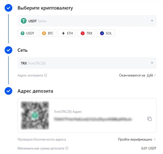 - Адрес для пополнения будет сгенерирован автоматически в виде текстовой строки и QR-кода.