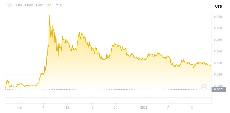 После успешного старта криптовалюта быстро достигла ATH на уровне, в 11 раз превышающем начальную стоимость. Затем цена стала снижаться и к январю 2025-го скорректировалась более чем на 60% от исторического максимума.