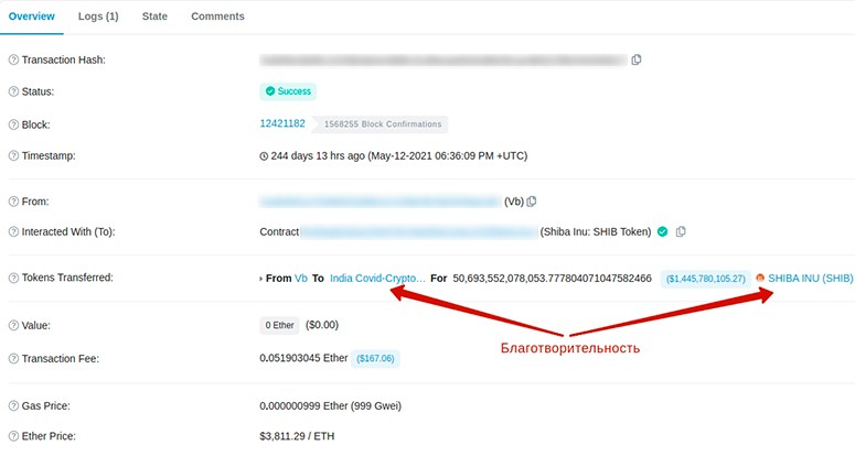 Наиболее яркий пример связан с Бутериным. Разработчик SHIBA INU, известный под псевдонимом Ryoshi, отправил Виталику 50% всех выпущенных SHIB. Это около 250 трлн коинов на общую сумму $13 млрд. По словам Ryoshi, целью передачи было уничтожение.