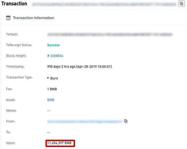 - Пример сжигания криптовалюты BNB