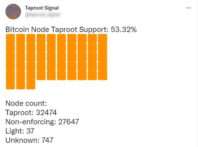 По данным Taproot Signal, 18 ноября 2021 года поддержка нод составляла 53,32%.