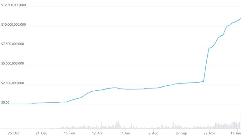 Рыночная капитализация с начала по конец 2021 г. выросла со $180 млн до $8,6 млрд, то есть в 48 раз. А к 20 января 2022 г. она достигла рекордных $10,82 млрд.