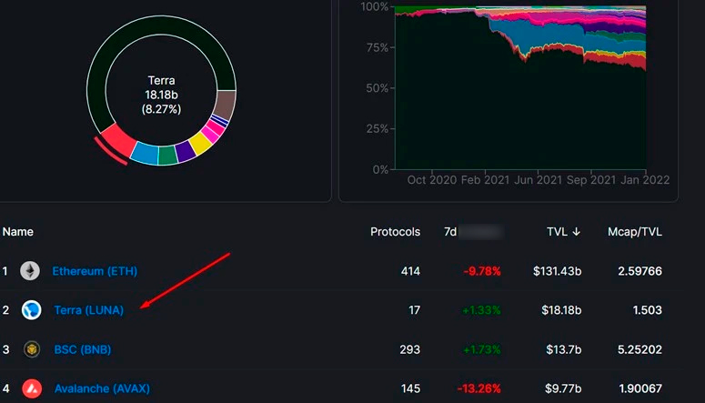 По объему заблокированных внутри активов экосистема занимает 2 место, уступив первенство лишь Ethereum. TVL в январе 2022 г. — $18,18 млрд. Она обошла даже такие известные проекты как Tron, Polygon, Binance Smrt Chain, Solana, Avalanche.