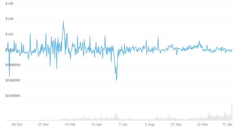 Цена монеты относительно стабильна. Есть строгая привязка к курсу USD. Отклонения минимальны, даже если сравнивать с другими обеспеченными криптовалютами. Максимальное, которое было зафиксировано (актуально на январь 2022 г.): от $0,7929 до $1,05. Это хорошие показатели.