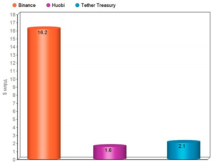 - Большая часть монет расположена на балансах криптобирж (около 70%). А 5% заблокирована в смарт-контрактах DeFi. Лидер — биржа Binance, которая в августе 2021 г. хранила 16+ млрд токенов, сгенерированных через протокол TRON. На втором месте шла платформа Huobi Global (1 865 000 000 USDT тоже стандарта TRC-20).