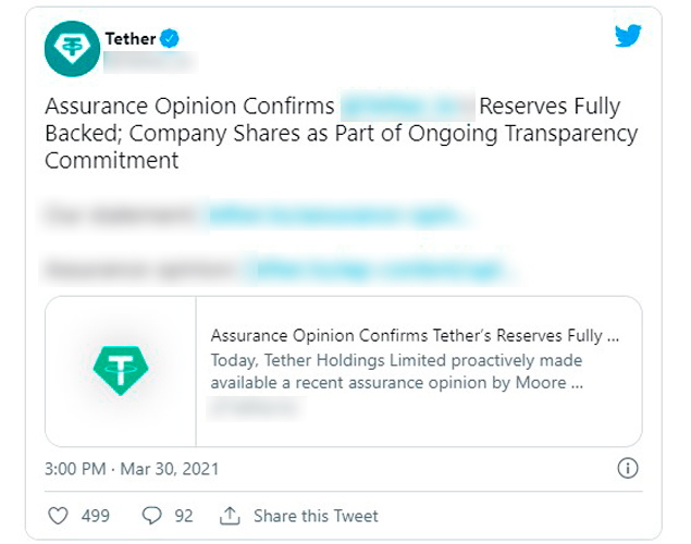 - 30 июля 2021 г. консалтинговая компания Moore Cayman подтвердила, что финансовых запасов по-прежнему хватает. Общая сумма всех активов компании: 67,7 млрд, а количество сгенерированных токенов — 62,6 млрд. Распределение резервов: большая часть (около 49%) сосредоточена в ценных бумагах, 22,5% находятся в налоговых векселях (США), а 10% — в денежных средствах, депозитах, которые можно вывести в течение 2-3 дней.