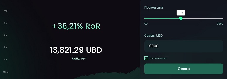 Опция доступна только для держателей UBD. Чтобы участвовать в стейкинге, достаточно разместить стейблкоин в кошельке. Доход будет начисляться автоматически (в зависимости от количества монет и срока удержания).