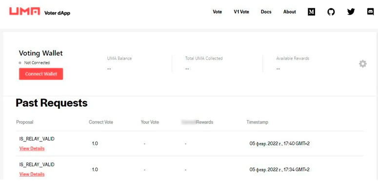 - Выбрать спор и отдать за него голоса. Все предложения идут под тикером UMIP. Токены в этот момент будут заблокированы. Через 48 часов после начала голосования будет начислена награда, а коины разблокируются.