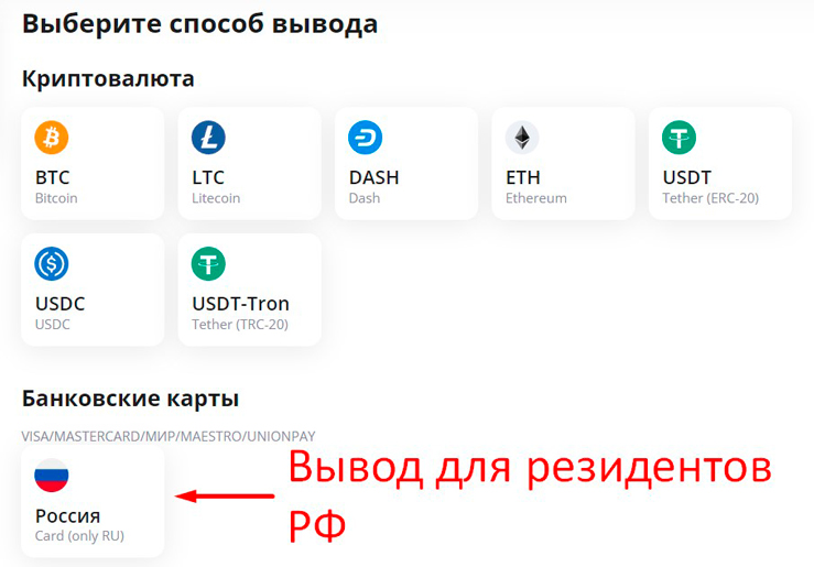 Пользователи из России могут выводить рубли. Платформа работает с картами Мир.