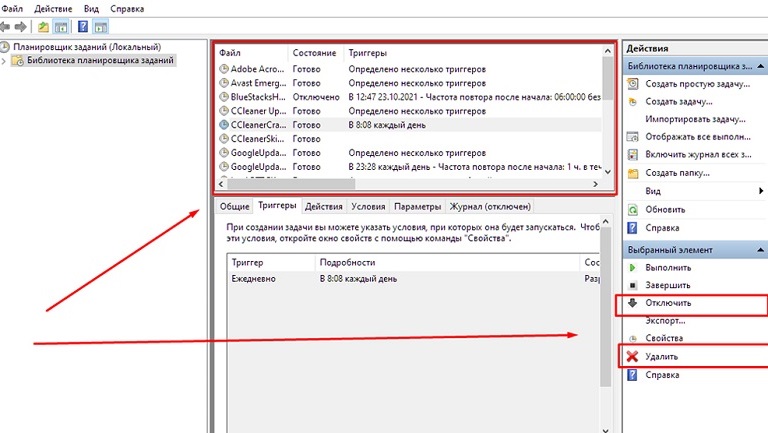 В этом разделе прописаны сценарии автоматического включения всех программ. Нужно проверить в интернете названия подозрительных процессов ― возможно, среди них окажутся важные для системной работы. Затем необязательные триггеры можно отключить в панели управления, а опасные — удалить. Это не избавит устройство от вируса, но запретит его автоматическую загрузку.