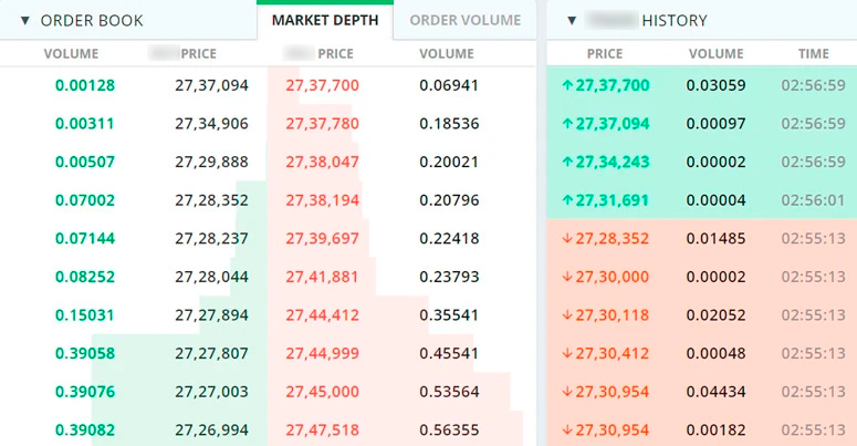 Выше графика размещена книга заявок и история сделок, а справа — форма с ордерами. Она разделена на две вкладки:
