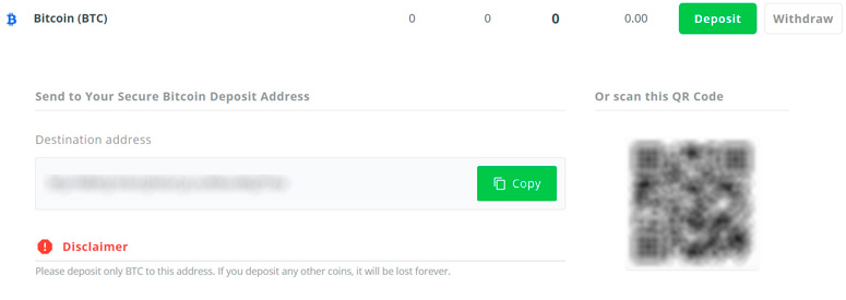 Пополнение баланса цифровыми монетами происходит по точно такой же схеме, как при использовании фиата. Необходимо выбрать коин из списка в разделе Funds и нажать напротив него на кнопку Deposit. На экране появится адрес кошелька для транзакции. Лучше использовать QR-код — его нужно отсканировать и сделать перевод.