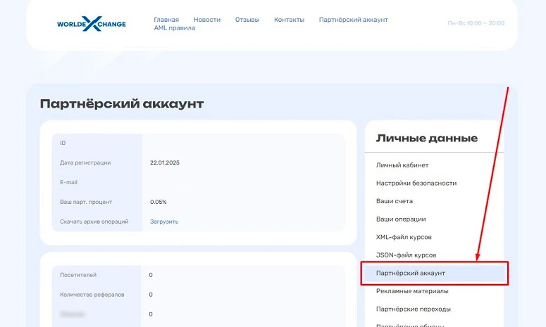 Авторизация открывает доступ к профилю. В Личном кабинете можно внести данные в анкету, изменить настройки уведомлений, посмотреть сведения о счетах и статистику по партнерской программе. В меню также есть дополнительные опции. Можно скачать курсы в виде файлов форматов XML и JSON, скопировать коды для вставки рекламных баннеров или создать заявку на вывод средств, начисленных по условиям партнерской программы.