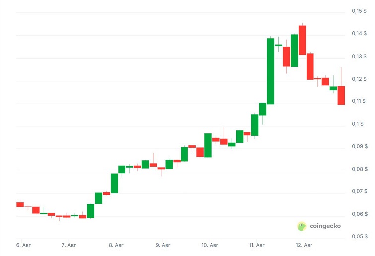 Курс монеты волатилен, что можно использовать для краткосрочных спекуляций. Например, с 7 по 11 августа 2025 года он увеличился более чем в два раза — с 0,059 до 0,139 USD. Затем за 2 дня монета снизилась до 0,109 USD.