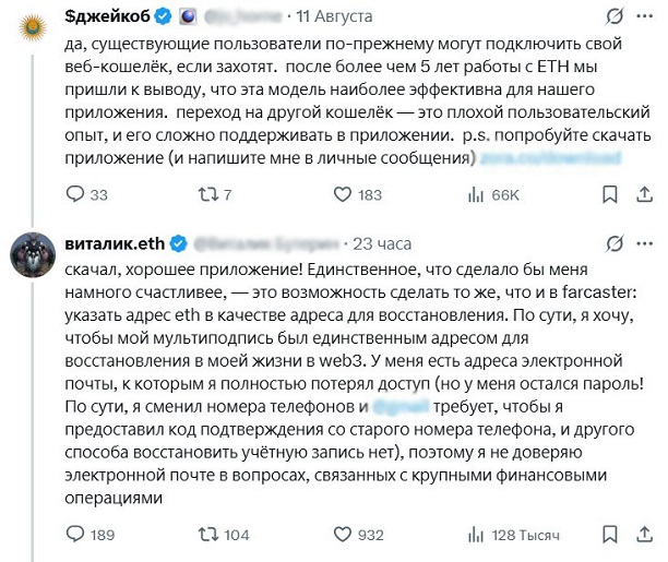 Популярность и упоминаемость проекта в сети увеличивается, о чем свидетельствует рост его нативного токена. Например, положительно о приложении Zora Network отозвался Виталик Бутерин, основатель ETH. Он вступил в диалог с Джейкобом Хорном в комментариях под одним из своих постов и дал рекомендации касательно того, что в нем можно улучшить.